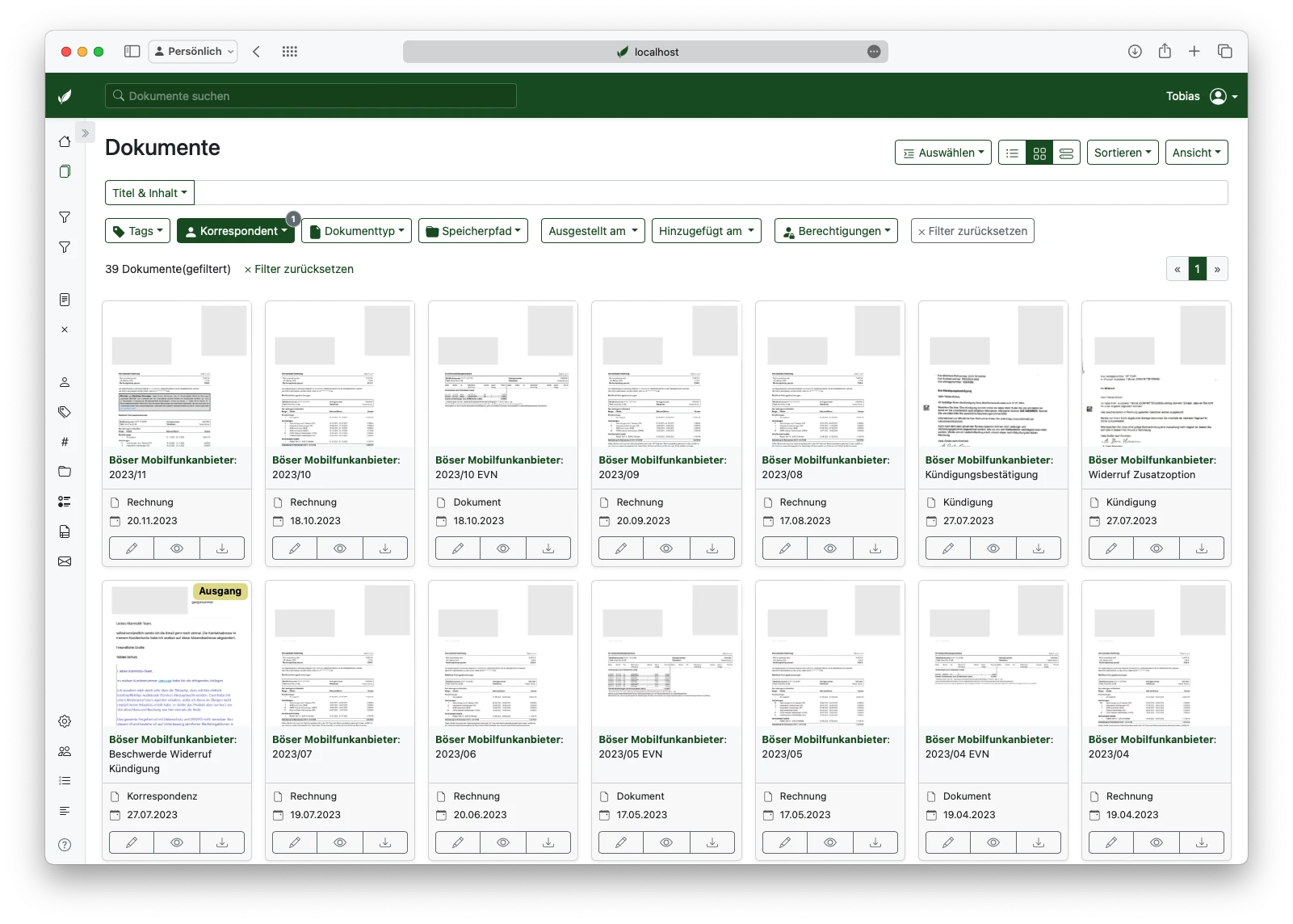 In Paperless-ngx können wir uns Korrespondenten als virtuelle Schubladen vorstellen, in denen alle Dokumente einer Person oder Firma abgelegt sind. Mit nur einem Klick finden wir alle Dokumente, die einem bestimmten Korrespondenten zugeordnet sind.