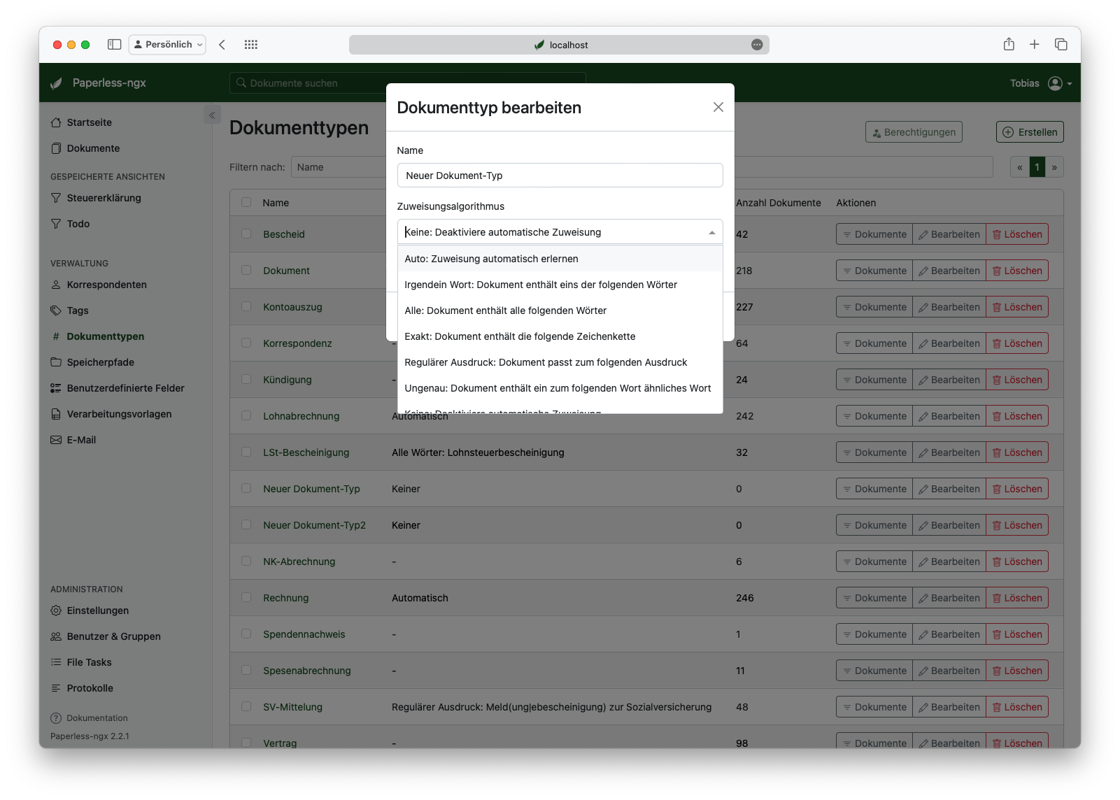 Paperless-ngx erlernt die Zuweisung mit der Zeit automatisch. Ich nutze die Auto-Erkennung, wann immer ich bei einem Klassifizierungsmerkmal genügend Dokumente erwarte; ein Model muss schließlich mit genug Daten trainiert werden.