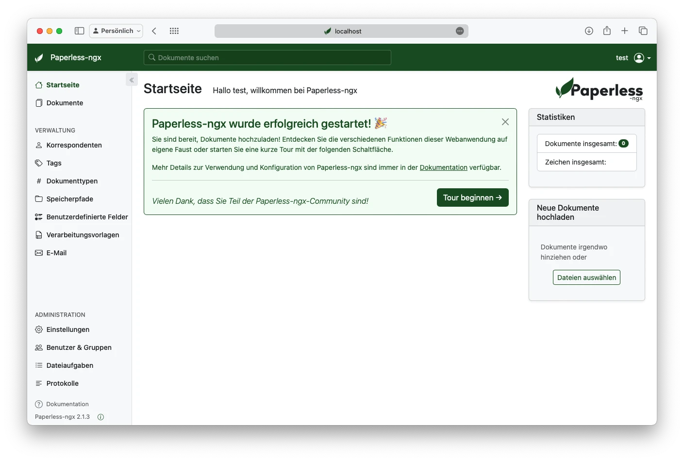 Und so sieht Paperless-ngx aus, wenn man es zum ersten Mal öffnet: