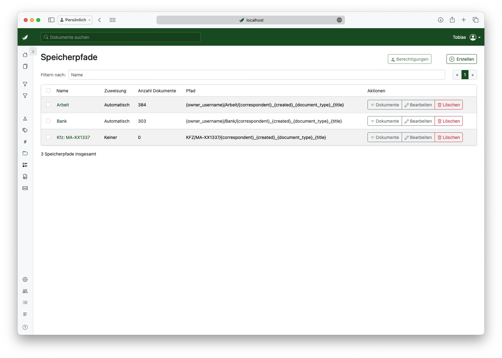 Paperless-ngx bietet noch eine weitere Möglichkeit, Schubladen zu erschaffen. Nicht dass wir davon nicht schon bereits einige hätten 😓. In diesem Fall handelt es sich um echte Ordner im Dateisystem, in denen die echten PDF-Dateien dann abgelegt werden, die du im DMS abspeicherst. Das ist natürlich ein reines Kosmetik-Feature und bietet Vorteile für Backups, oder wenn man all seine Dokumente bspw. zusätzlich bei einem Cloud-Anbieter speichern möchte.