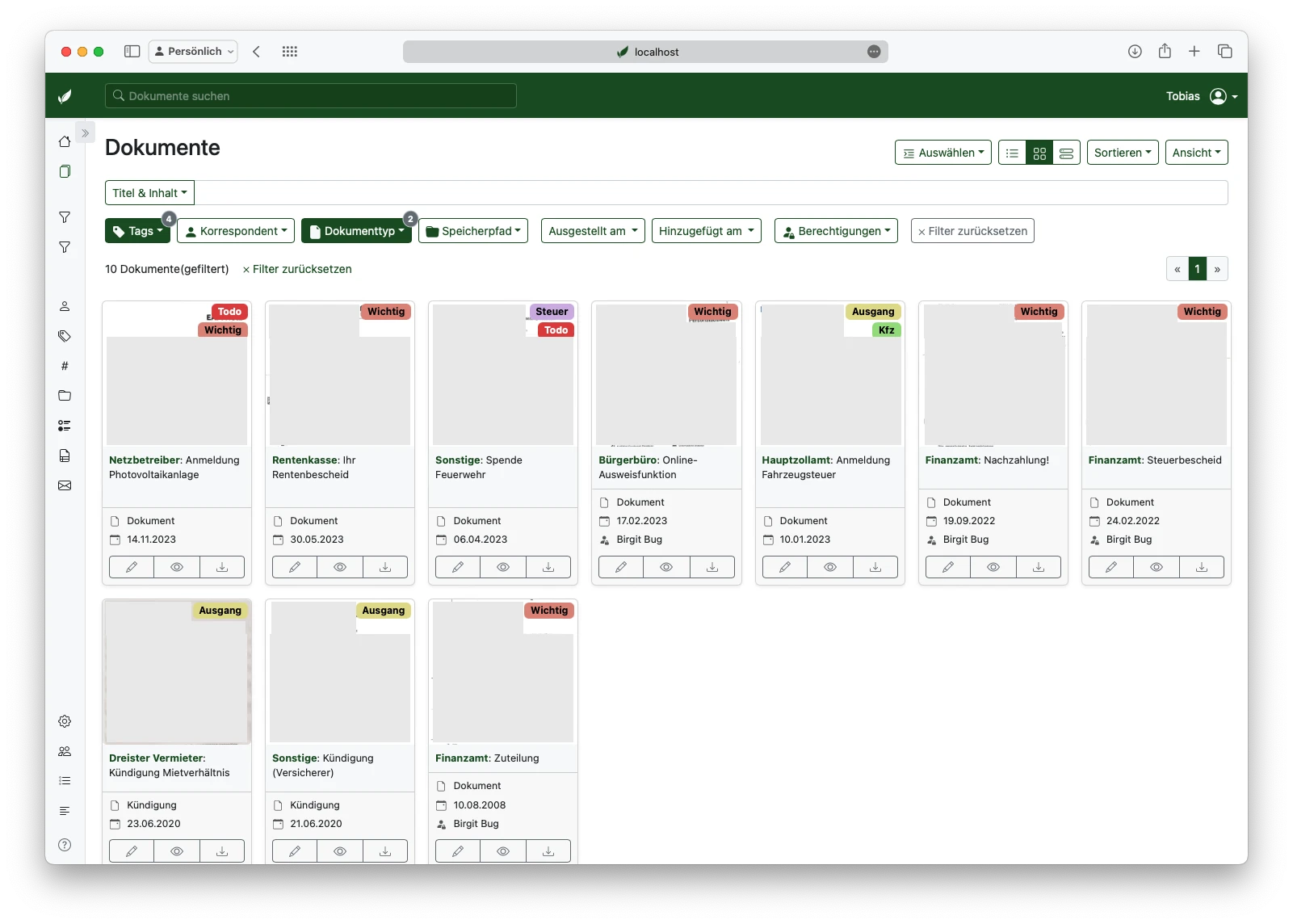 Tagging ist prima: bei Paperless-ngx kann man einem Dokument damit einen Kontext verleihen, oder sogar mehrere. Ähnlich wie bei Korrespondenten kann man Tags wie virtuelle Schubladen verstehen, in denen Dokumente liegen. Sie eignen sich erstklassig, um Dokumenten eine Thematik zuzuweisen, die über viele Korrespondenten und Dokumenttypen verteilt ist (z.B. Kfz) - oder einfach nur als Status Indikator.